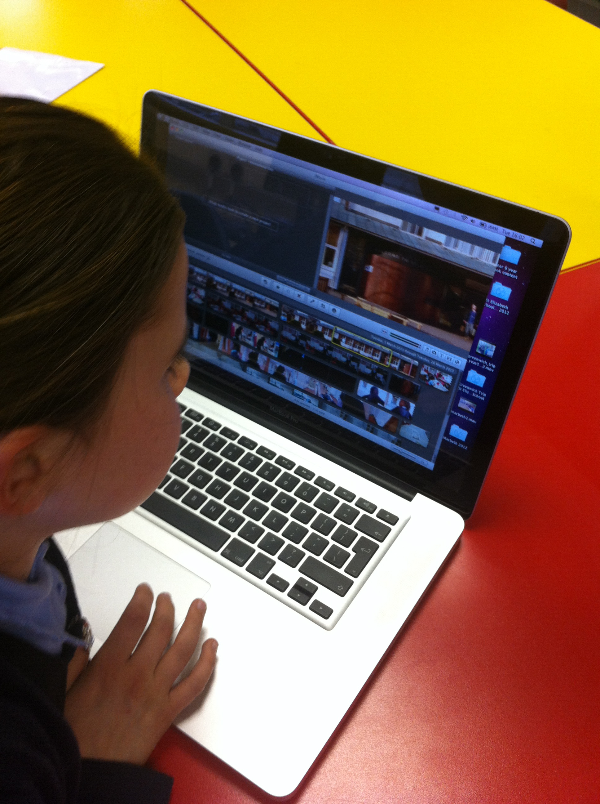 The next session sees the group editing their work on 3 Mac books. I remind them about selecting the good bits of clips to drag up into their projects and quickly create an example trailer with their footage, including some slowed down dialogue from some ‘accidentally filmed’ footage of the whole group talking – this is used as a soundtrack/sound effect to my example trailer. There’s a technical issue with one group but eventually they’re up and running, selecting clips and doing voice-over work. Two groups record their voices too loudly so they have to do them again. I explain that they can always make their voices louder in the software.