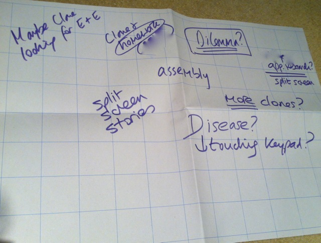 Last session we started throwing some ideas around for our sequel to Run School Run 1 involving the clone, a dilemma, a virus/disease, a split screen. All of which sounds promising.