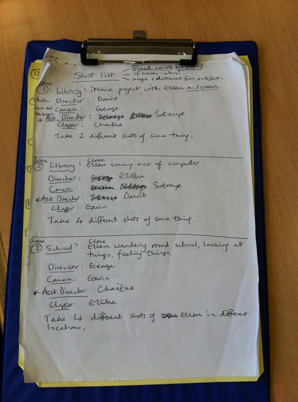 We manage to get 4 shots done in this session, which is great. First we discuss the plot to refresh our memories and look at the photo-storyboard on the blog. We run through a few filming techniques eg. the importance of camera position and angle and the various roles of the film crew. Everyone will have a go at each job. Let’s remember the order of events:
